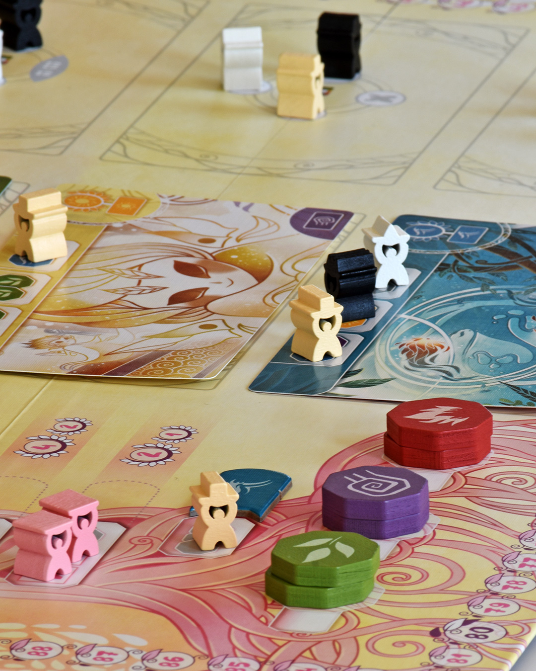 Ziel ist es, bei der Wertung möglichst viele Gunstmarker einer Farbe zu besitzen. Dazu muss ich selbst mindestens eine Arbeiterfigur auf eine der ausliegenden Karten gesetzt haben und sämtliche Einsetzfelder der Karte müssen voll sein. Oft stehe ich vor einem Dilemma: Wenn ich meinen Worker auf die grüne Karte setze, erhalte ich einen Gunstmarker, helfe aber gleichzeitig dabei, die Karte vollzumachen. Davon profitiert der Spieler, der besonders viele grüne Gunstmarker gesammelt hat. Nur wenn ich das selbst bin, ist alles in Ordnung. Die zahlreichen Sondereffekte und der „große Baum“ mit Zusatzfunktionen machen Inori unintuitiv und verkopft.