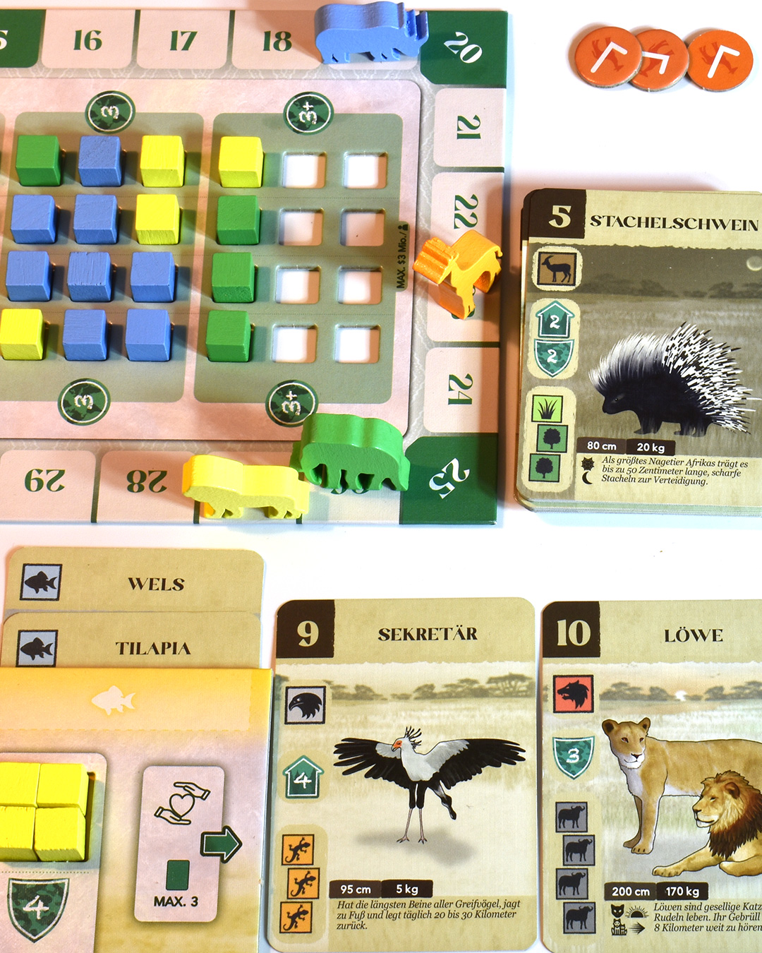 Klar ist: Ohne Pflanzen, Wirbellose und Fische funktioniert hier nichts – es gibt keine Nahrungskette und kein Leben im Reservat. Das Zebra frisst Gräser. Der Löwe frisst das Zebra. Dabei wird jedoch niemand wirklich gefressen. Wenn ich die Löwenkarte spiele, reicht es, wenn ich das Zebra bereits ausliegen habe – und es bleibt dann auch liegen.