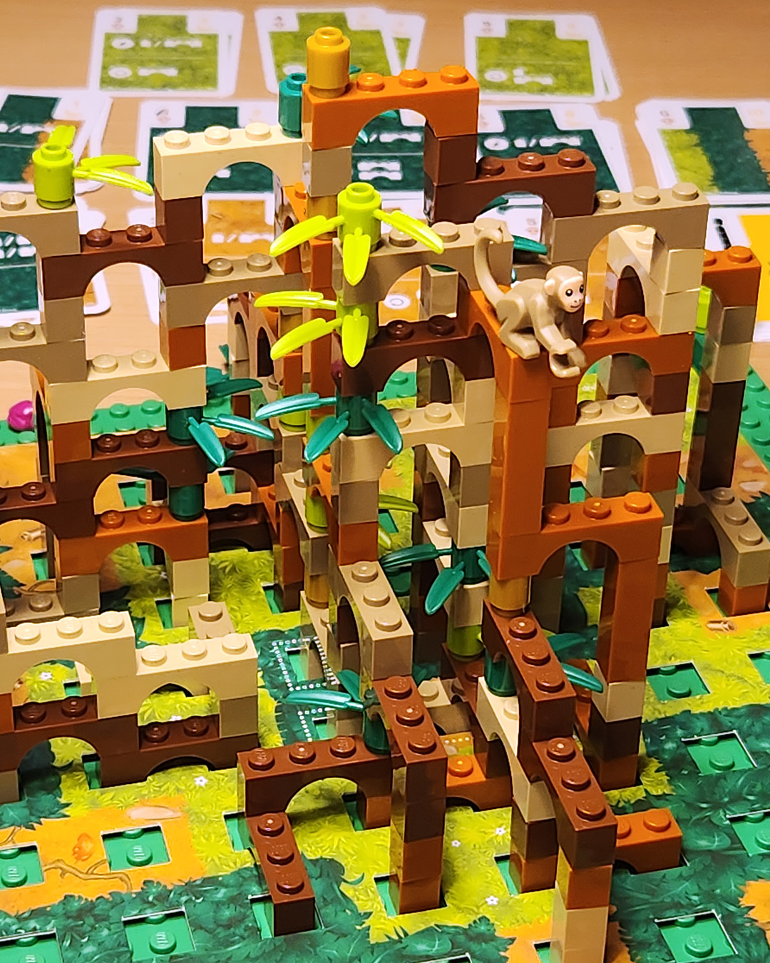 Das Schöne an Lego: Man kann damit bauen, etwas errichten, konstruieren. Das macht auch bei Monkey Palace Freude, wo wir das mit einer Spielregel verbinden. Wir bauen nicht zweckfrei, wir bauen nicht schön, sondern wollen Siegpunkte sammeln. Die kriegt man in Form von Spielkarten – je nachdem, wie hoch man seine Treppe baut. Wobei Treppen hier nicht wörtlich zu nehmen ist, weil wir uns Affen vorstellen müssen, die nicht nur eine Stufe erklimmen können, sondern auch mal größere Distanzen senkrecht überwinden.