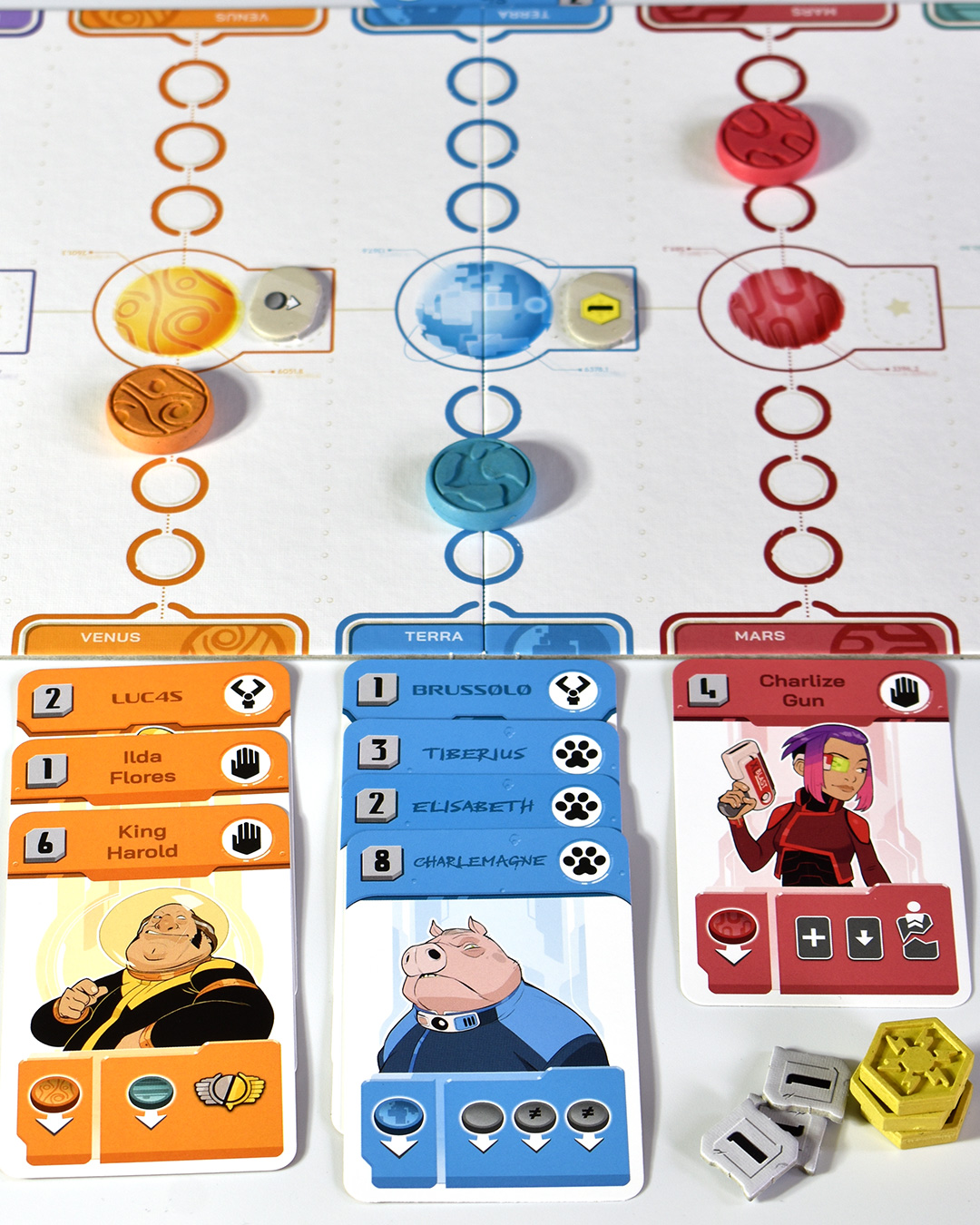 Mit Zenith (französisch: Zénith, deutsch: Zenit) haben die französischen Autoren Grégory Grard (Auf den Wegen von Darwin) und Mathieu Roussel, die bereits bei Castle Combo zusammengearbeitet haben, ein beeindruckendes Duellspiel vorgelegt. Wer zieht die Planeten Merkur, Venus, Erde, Mars und Jupiter auf seine Seite? Es ist wie bei einem Tauziehen, allerdings gleichzeitig an fünf Seilen. Die thematische Umsetzung ist nicht wirklich überzeugend, was aber nicht stört. Denn das Spiel ist rasant und bleibt bis zum letzten Moment spannend. Manchmal sind die Duelle kurz, weil wir offensiv angreifen. Und manchmal entstehen epische Partien. Darüber hinaus gibt es eine gelungene Vier-Personen-Variante, bei der zwei Teams gegeneinander antreten.