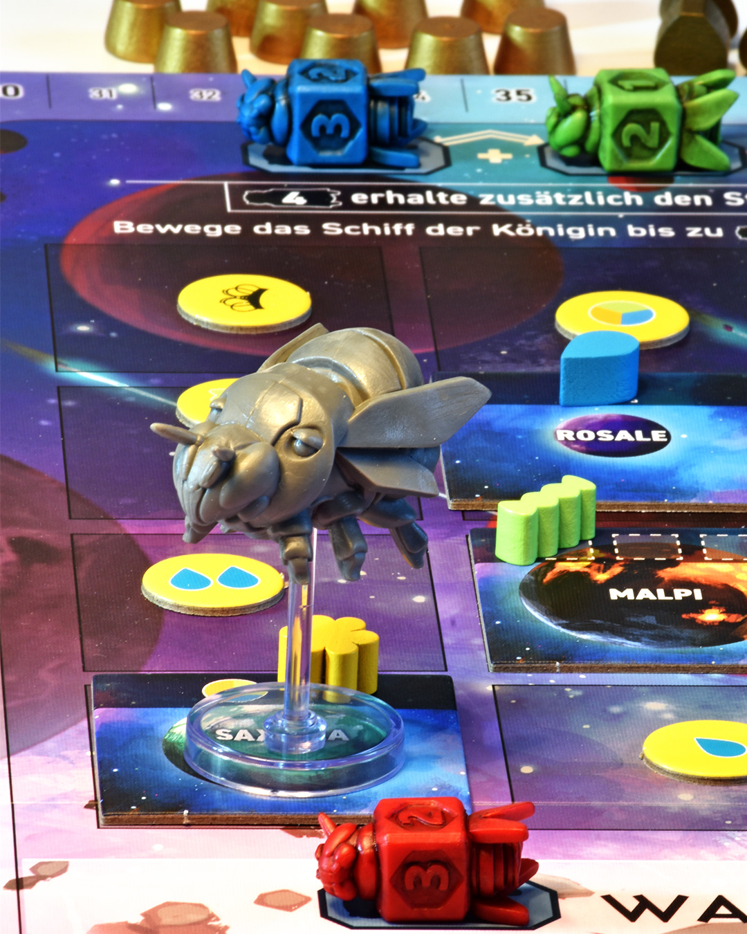 Es ist ein Arbeiterinneneinsetzspiel mit Bienen. Dass diese thematisch als Astrobienen im Weltall unterwegs sind, lassen wir mal dahingestellt. Sondern konzentrieren uns auf die Mechanik, denn diese ist für das Workerplacement-Genre ziemlich bemerkenswert. Denn ich kann meine Biene gerne auf bereits besetzte Einsetzfelder platzieren. Die dort sitzende Biene wird einfach zur Seite geschubst. Das hört sich gemein an, ist es aber nicht. Es ist eher eine Win-Win-Situation. Nichts wird blockiert, und ich darf den Wert von weggeschubsten Bienen zu meinem hinzuaddieren – es sei denn, diese Bienen findet keinen Platz auf den Einsetzfeldern mehr und wird deshalb nach Hause geschickt. Dann gewinnt sie an Stärke. Alle hoffen, dass ihre Biene schnell und oft weggeschubst wird, um zu einer bärenstarken Vierer-Biene zu kommen, die man zum rechten Zeitpunkt für eine ganz besondere Bonus-Aktion nutzen möchte. Anschließend scheidet diese Biene aber aus und begibt sich ins Tiefschlafabteil.