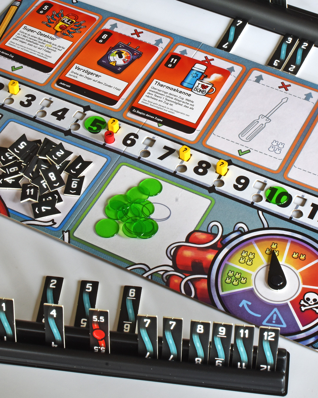 Ich habe das Kabel Nr. 4. Nun muss ich bei den Mitspielenden auf eines der dortigen verdeckt gehaltenen Kabelplättchen tippen, in der Hoffnung, dass es ebenfalls eine 4 ist. Solange es nicht das rote Kabel ist, sind ein paar wenige Fehlversuche erlaubt. Egal ob richtig oder falsch: Das Plättchen wird aufgedeckt, und hilft nun bei späteren Rateversuchen. Denn ich weiß: Alle Mitspielenden haben die Kabelkärtchen in aufsteigender Zahlenfolge sortiert. Und deswegen ist das kein Ratespiel, sondern ein Deduktionsspiel, bei der wir unsere Entschärfungsversuche aus den zuvor erlangten Informationen ableiten.