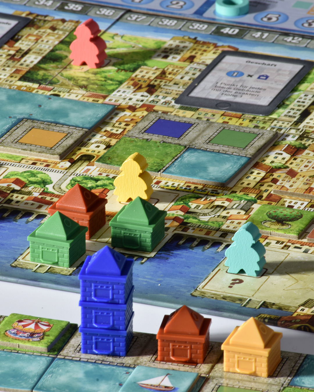 Nicht ganz so gut gefallen mir die uneleganten Wertungskarten, die mit Text arbeiten und beispielsweise allen dreigeschossigen roten Gebäuden Punkte geben. Reichlich acht Karten werden ich am Ende gesammelt haben. Die werten wir in einem – gerade in Vierer-Runden – einen Tick etwas zu langwidrigen Prozess aus, was Punktesalat-Geschmäckle hinterlassen kann. Jedenfalls kann man, wenn man taktisch geschickt ist, über die Wertungskarten deutlich mehr Punkte generieren, als über die acht unterschiedlichen Städtetafeln von New York bis Rio. Von diesen wird in jeder Partei eine verwendet, und sie enthalten Zwischenziele, um deren schnelle Erfüllung wir konkurrieren. Das soll den solitären Charakter des Spiels wohl ein wenig kaschieren.