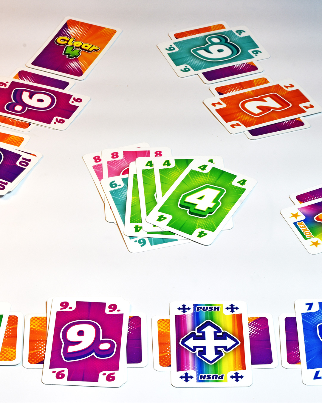 Ich starte mit zwölf Karten auf dem Tisch – teils offen, teils verdeckt – sowie acht Karten auf der Hand und muss sie Mau-Mau-artig loswerden. Immer wenn vier gleiche Zahlen auf dem Ablagestapel liegen, „cleare“ ich den Tisch und erhalte einen Doppelzug. Besonders reizvoll sind die verdeckten Karten, die blind ausgespielt werden, während kleine Gemeinheiten wie die „Push“-Karte jemanden kurz vor dem Sieg noch einmal ausbremsen können.