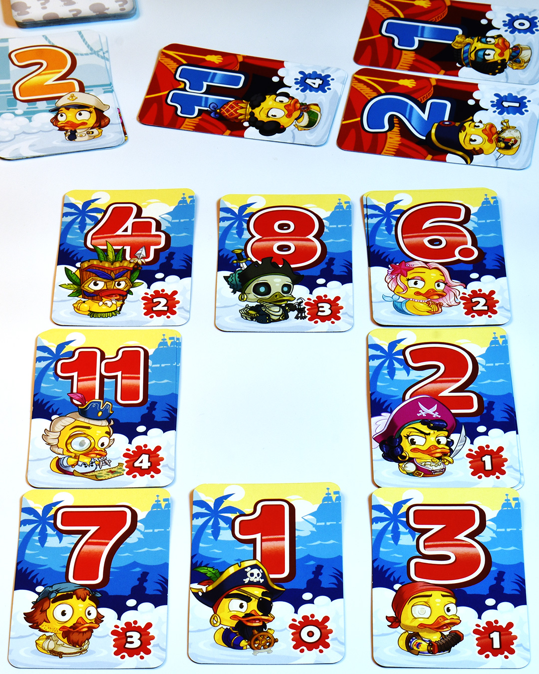 Wir alle haben zwölf durchnummerierte Quietscheentchen offen vor uns auf dem Tisch liegen. Die Aufgabe: die eigene Entenbande daran zu hindern, mit dem Badewannenwasser zu spritzen. Eine Mitspielerin macht die Ansagen und zieht dazu vom zentralen Kartenstapel eine Nummer, die sie laut ruft. Beispielsweise die „3“. Jetzt schieben alle ihre Ente Nr. 3 auf eine benachbarte Ente, etwa die Nr. 10. Diese gilt jetzt als gezähmt, weil verdeckt. Wenn später erneut „3“ angesagt wird, bewege ich den gesamten Stapel. Wenn die längst verdeckte „10“ angesagt wird, muss ich passen und „Quak“ rufen. Nach und nach schrumpft die Anzahl der noch sichtbaren Karten, und damit schrumpft auch die Zahl der Miesen – das ist die kleine Ziffer auf den Karten.
