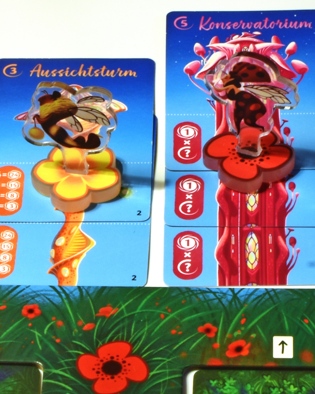Am besten ist es, wenn meine Fee ihre Reise vor mir, auf meinen Karten, beendet. Dann kassiere ich je nach Funktion der dort liegenden Spielkarte, auf der ein Pilz abgebildet ist, Siegpunkte. Wenn meine Fee beim Mitspieler landet, kassiert dieser mit seiner Pilzkarte die Siegpunkte. Ich kann nur in dem Fall profitieren, wenn ich den identischen Pilz auch in meiner eigenen Auslage habe.