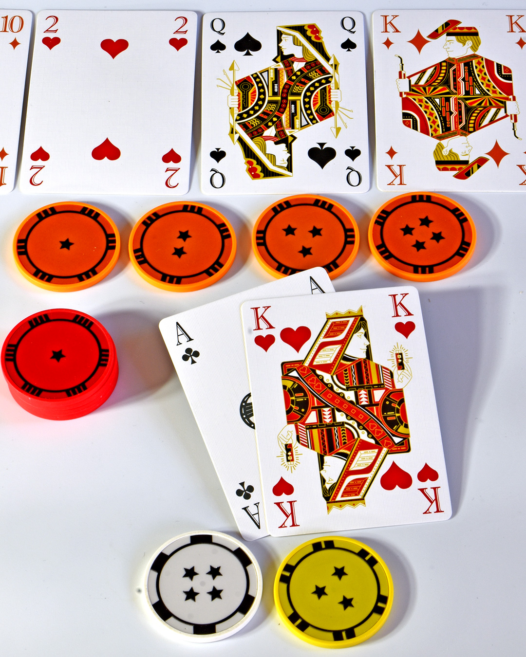 Deutlich schwieriger ist es, das kooperative Ziel zu erfüllen: nämlich den Mitspielenden zwischen den Runden zu signalisieren, wo man steht. Dazu kommen die weißen, dann die gelben, dann die orangen Poker-Chips zum Einsatz. Bildet meine Hand gemeinsam mit den offen ausliegenden Karten die schlechteste Kombination, dann greife ich nach dem Jeton mit dem einen Stern. Vermute ich bei mir gute Karten – und das kann bereits ein Paar sein – greife ich nach einem Jeton mit vielen Sternen.