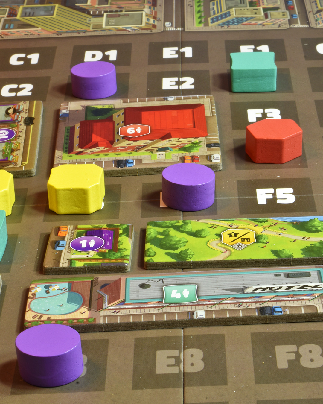 In einem weiteren Zug können wir die Grundstücke, die uns gehören, bebauen. Oft gleich mehrere benachbarte auf einmal. Denn uns steht ein persönlicher Satz an Gebäuden zur Verfügung, die teils nur eine Baufläche benötigen. Manchmal sind es aber auch größere Grundstücke – längliche, quadratische und über Eck gehende. Je größer, desto besser – zumindest am Ende. Da man kleine Häuser aber auch abreißen und mit etwas Größerem überbauen kann, sobald man die Nachbargrundstücke erworben hat, kann man auch schrittweise vorgehen. Falls einen die gegnerischen Spielerinnen die Chance lassen. Grundstein von Metropolis ist nämlich ziemlich konfrontativ. Ein Grundstück, das am besten in die eigene Planung passt, ist oft genauso gut, wie eines, dass die gegnerische Planung zerschießt. Hauptsache, die Koordinatenkarte war preisgünstig zu bekommen.