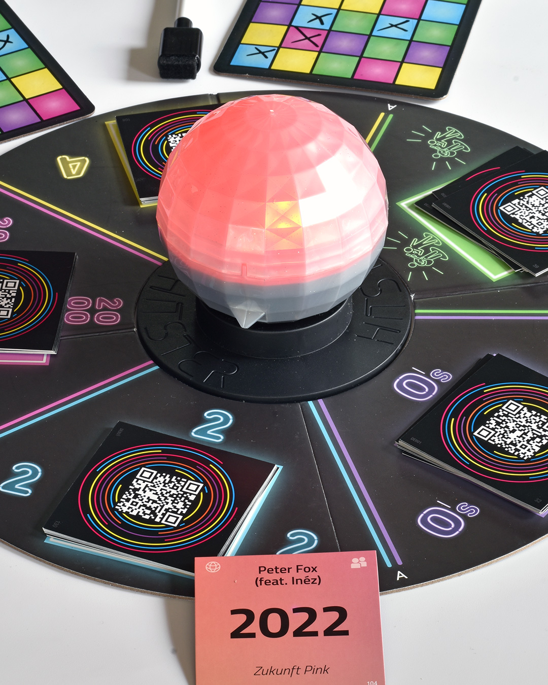 Gekrönt wird das Spiel von einer batteriebetriebenen und mäßig gut funktionieren Discokugel, die wir schwungvoll drehen müssen, damit die Farbe der Fragenkategorie festgelegt wird. Aber das erhoffte Zufallsergebnis kommt nicht wirklich, zu oft bleibt die Anzeige an derselben Stelle stehen. Was besonders dann ärgerlich ist, wenn allen nur noch eine Bingo-Farbe fehlt. Der in die Kugel integrierte Timer zählt die Zeit zu schnell herunter. Denn nach 25 Sekunden ist der Refrain bei vielen Stücken noch lange nicht zu hören. Für chronische Besserwisser, die sich durch singende Mitspielende eh gestört fühlen, ist das kein Problem, weil sie schon nach wenigen Takten mit kryptischen Geräuschen die richtige Antwort wissen.