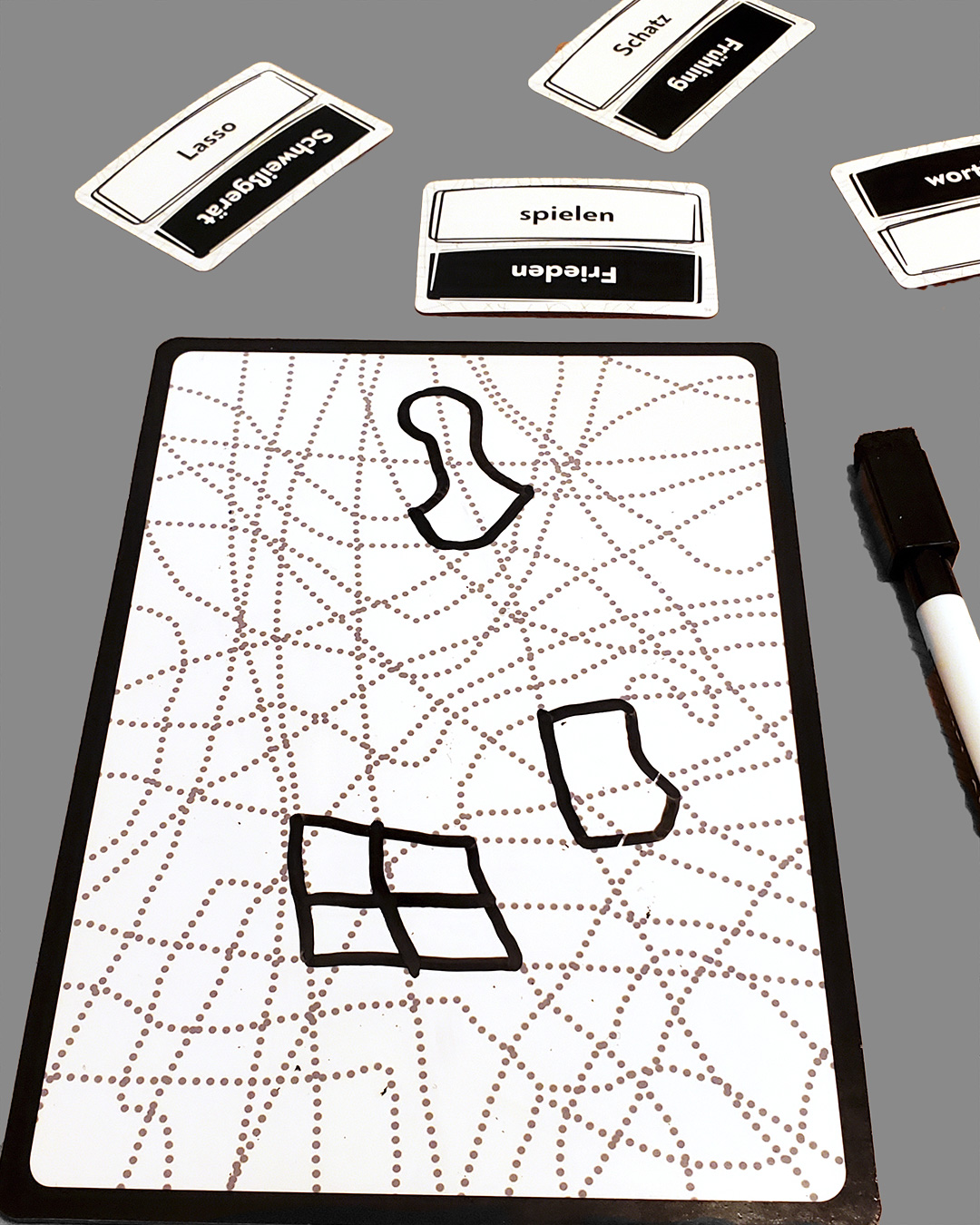 Gleichwohl stößt diese Herausforderung bei vielen Leuten auf großes Interesse. Bei entsprechend talentierten Mitspielenden entstehen beeindruckende Gemälde. Was wir zu malen haben, steht auf Kärtchen, die wir vor den anderen geheim halten. Nach der Zeichenphase werden die Wortkärtchen eingesammelt und mit der gleichen Anzahl weiterer Kärtchen ergänzt. Gut gemischt liegen sie dann auf dem Tisch. Reihum müssen wir jeweils einen Begriff erkennen, der von niemandem gemalt wurde, und das Kärtchen ausschließen.