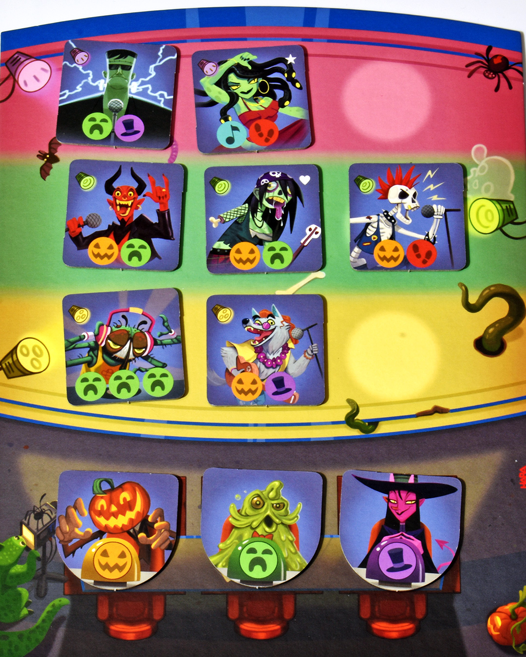 Es ist ein Echtzeitspiel, in dem die Musik den „Grusel-Takt“ vorgibt. Wenn ein „gespanntes Luftschnappen“ ertönt, decke ich ein Plättchen auf. Und beim anschließenden Applaus nehme ich eines der dann sechs offen liegenden Plättchen und lege es auf mein Tableau. In die untere Zeile gehören die Jurymitglieder. Und in den drei oberen Zeilen ist Platz für neun MonStars.