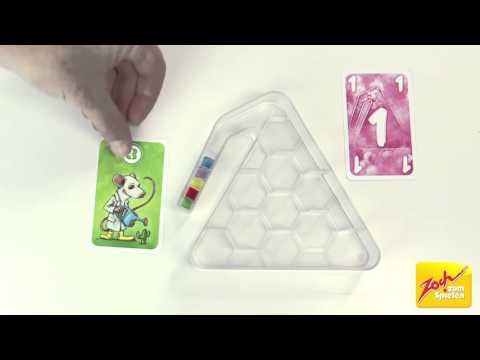 Ich halte eine offene Kunststoffform in der Hand, die wie ein halbierter Kolben aus einem Chemielabor aussieht. Ich muss mit Rütteln und Schütteln möglichst schnell die Würfelchen aus dem Startbereich links unten in den Zielschnabel links oben bewegen. Entscheidend ist: die Würfel müssen in der durch fünf Spielkarten vorgegebene Reihenfolge ins Ziel gebracht werden. Das ist nicht so einfach, aber es funktioniert mit etwas Geschick überraschend gut. Allerdings sitzen mir die Mitspieler im Nacken, die zeitgleich in ihrem eigenen Kolben die gleiche Aufgabe bewältigen müssen. Wer zuerst fertig ist, schnappt sich die Karte mit der 1, und die nachfolgenden Spieler bekommen die drauffolgenden Positionskarten.