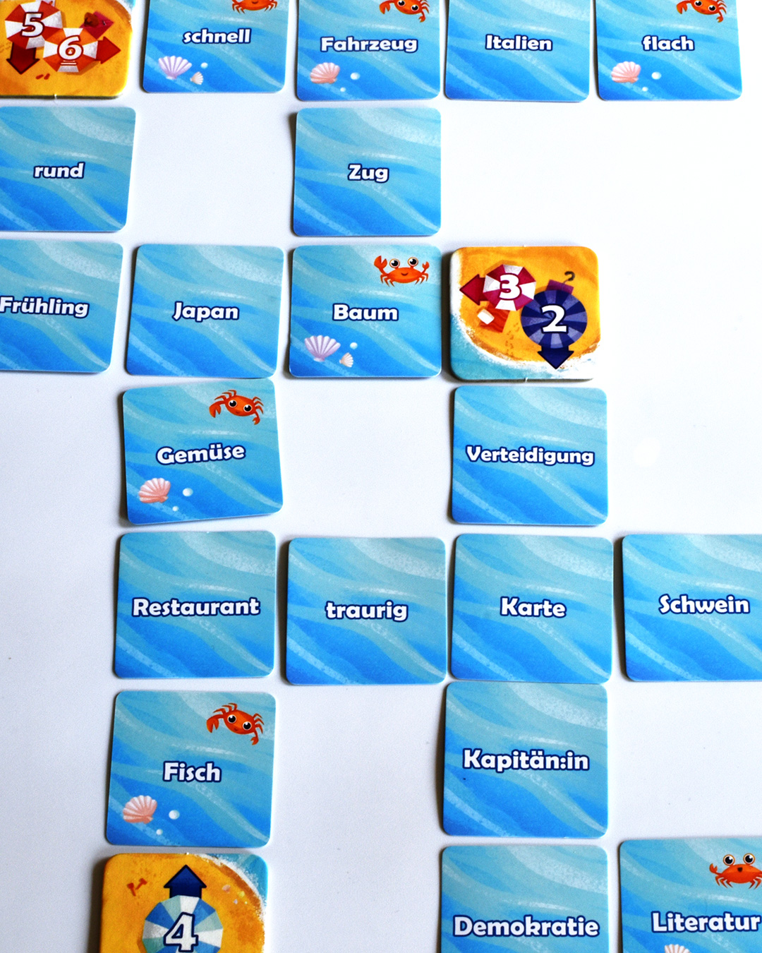 Es gibt Wörter, die andere Wörter beschreiben. Das ist ein beliebtes Prinzip, ganz besonders populär durch Codenames, und wird hier für ein kooperatives Spiel umgesetzt. Am Ende sieht es aus wie ein Kreuzworträtsel. Denn man legt ein Wortkärtchen, das man aus der Auslage wählt, auf den Tisch. Das nächste Wort wird waagerecht oder senkrecht angelegt. Immer, wenn zwei Kärtchen nebeneinanderliegen, muss ein Kärtchen, auf dem eine Zahl steht und sich ein Pfeil befindet, angelegt werden. So werden Wörtergruppen markiert. Ob die Gruppe bereits vollständig ist, wissen wir in diesem Moment noch nicht. Denn die Spielenden können die Reihe noch verlängern. Sie können aber meistens auch eine neue Wortgruppe beginnen, so dass hier keine langen Denkpausen entstehen, weil jemandem keine gute Idee für zusammenpassende Begriffe hat. Sobald wir zehn Wortgruppen auf dem Tisch haben, endet die erste Phase. Nun schreiben wir alle auf unserem persönlichen Zettel auf, welche Begriffe mit den Wortgruppen gemeint sind und hoffen, dass die Mitspielenden das Gleiche notieren.