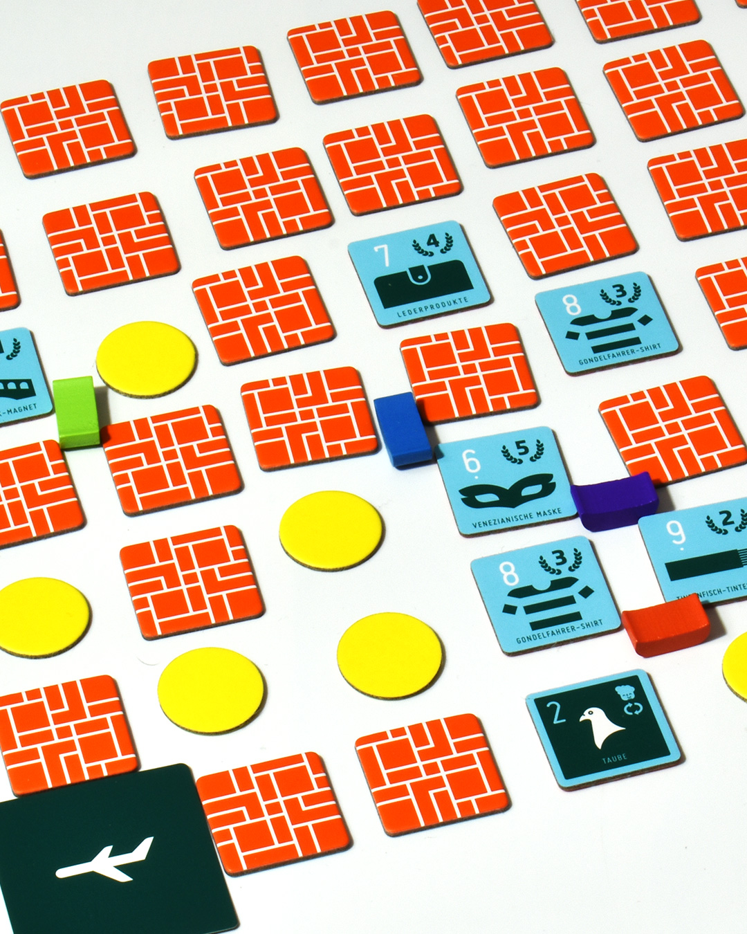 Der sieben mal sieben Felder große Plan wird aus Plättchen improvisiert, und dazwischen befinden sich die Grachten. Auf der Plättchen-Rückseite finden wir die Souvenirs. Ich decke irgendwo ein Plättchen auf. Dann würfele ich und ziehe meine Gondel bis zu einer entsprechend entfernten Kreuzung. Wenn ich mag, darf ich dort eines der vier angrenzenden Souvenirs kaufen. Ziel ist es, Drillinge zu sammeln – die seltenen venezianischen Masken bringen fünf Punkte, Kühlschrankmagnete nur einen Punkt.