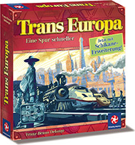 Trans Europa, drei Jahre später erschienen, ist quasi das identische Spiel. Hier gibt es ein paar Fährverbindungen, die aber genauso einfach zu befahren sind, wie die Gebirgsstrecken. Ärgerlich ist, dass das Spiel für Kinder, die gerade lesen gelernt haben, nicht einfacher geworden ist. Statt die amerikanische Mittelstadt Bismarck auf dem Plan zu suchen, geht es jetzt darum, Kyiv und Charkiv – irgendwo in der Ukraine – zu suchen. Während bei Trans America die Lage einer Stadt wenigstens auf den Spielkarten eingezeichnet war, hat man darauf bei Trans Europa leider verzichtet.