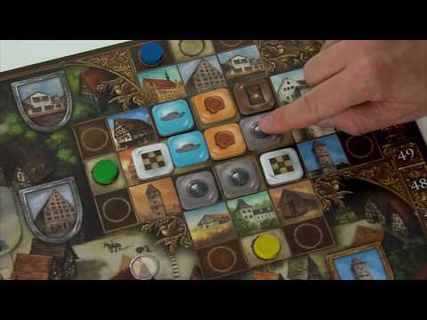 Ein mittelalterlicher Stadtplan, ein beeindruckender dreidimensionaler Münster, Bötchen auf der Donau und jede Menge Siegpunkte zu gewinnen: Das ist Ulm. Außerdem gibt es den Münsterplatz, der zunächst das Interesse an diesem Spiel weckt. Drei mal drei Pflastersteine sind dort verlegt, und mit ihnen wird eine Art Das verrückte Labyrinth gespielt. Wobei die Steine – korrekt als Aktionssteine bezeichnet – gar kein Labyrinth darstellen. Aber man schiebt einen zufällig aus dem Sack gezogenen Aktionsstein in eine Spalte beziehungsweise Reihe hinein, so dass auf der anderen Seite ein Stein rausgeschoben ist. Sinn der Übung: Das eine neue und die zwei verbleibenden Plättchen sagen mir, welche Aktionen ich zu unternehmen habe. Das Pflaster des Münsterplatzes besteht nämlich aus fünf verschiedenen Farben, die jeweils für eine andere Zugmöglichkeit stehen.