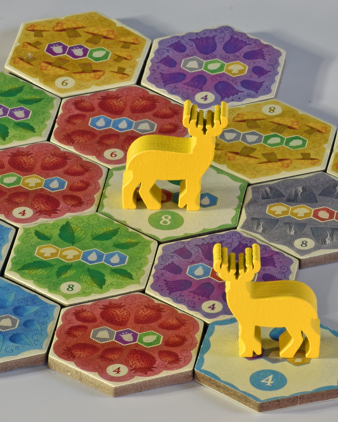 Ich wähle eines der sechseckigen Farbplättchen aus, die in der Tischmitte liegen, um es an meine Landschaft anzulegen. Ich baue damit Wege. Meine Tierfigur – Hirsch, Frosch, Vogel oder Hase – muss die auf dem Plättchen angegebene Aufgabe erfüllen, von dem aus sie startet. Beispielsweise von Blau nach Grau nach Rot. Wenn ich möchte und es möglich ist, kann ich loslaufen und auf die aneinanderliegenden Plättchen der geforderten Farbe springen. Dann erhalte ich die auf dem Startplättchen angegebenen Siegpunkte. Falls auf dem Zielplättchen ein Weg notiert ist, auf dem ich zum nächsten Ziel weitergehen kann, geht es weiter. Dafür gibt es zusätzliche Bonuspunkte. Die Krönung sind zwölf Extrapunkte für fünf Züge hintereinander, die man mit bis zu vier Figuren absolvieren darf.